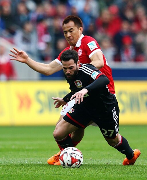 しかし、試合はマインツの思惑通りにいかず、レバークーゼンのペースで進んだ。岡崎は、レバークーゼンのセンターバックコンビ、トプラクとイェドバイの監視下に置かれ、セントラルMFベンダー、カストロからも挟み込まれ、前線で孤立した。14分、岡崎は相手ボールを奪って縦突破し、ファーサイドにクロスを入れてデ・ブラシスのシュートをお膳立てした。前半、岡崎が絡んだ数少ないチャンスメークは、このように単騎で攻め込んだものだった。