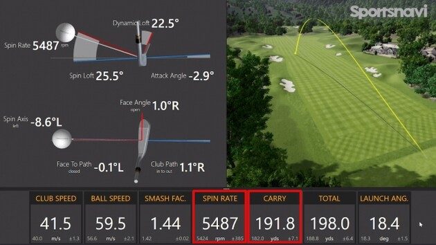 球の高さも出てバックスピン量もあるので、グリーンで球を止めていくことができるでしょう。ピンポイントでバックスピン量でピタリと止まらないかもしれませんが、落ちてから2〜3ヤードの中には止まる感じがします。