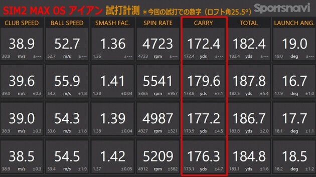 前作のSIM MAX OSアイアンが7番アイアンで26度。今作のSIM2 MAX OS7番アイアンは25.5度。0.5度立っていて、その辺りが飛距離や弾道の違いにどうつながってくるのか試してみたいと思います。