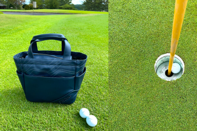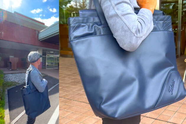 同じ素材&デザインのトートバッグでゴルフ場に行くのは初めての経験だったのですが、まるで高級人気ブランドのようなトートバッグの中には着替えや飲み物をはじめ沢山の荷物が。