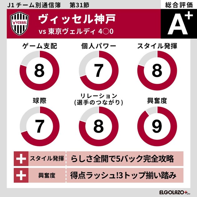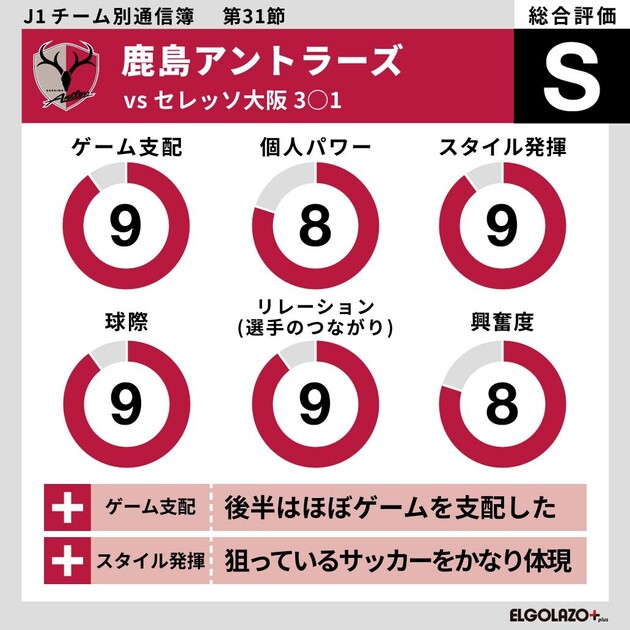 【総評】5バックの守備ブロックをいかに攻略するか。攻撃の連動性を問われた試合だったが、サイドを崩した得点、クロスからの得点、ハイプレスからの得点と“らしさ”全開のゴールラッシュを実現。大迫勇也、宮代大聖、エリキの3トップが全員得点を奪い、守っては無失点締めと攻守盤石。首位・鹿島追撃の準備は整った。