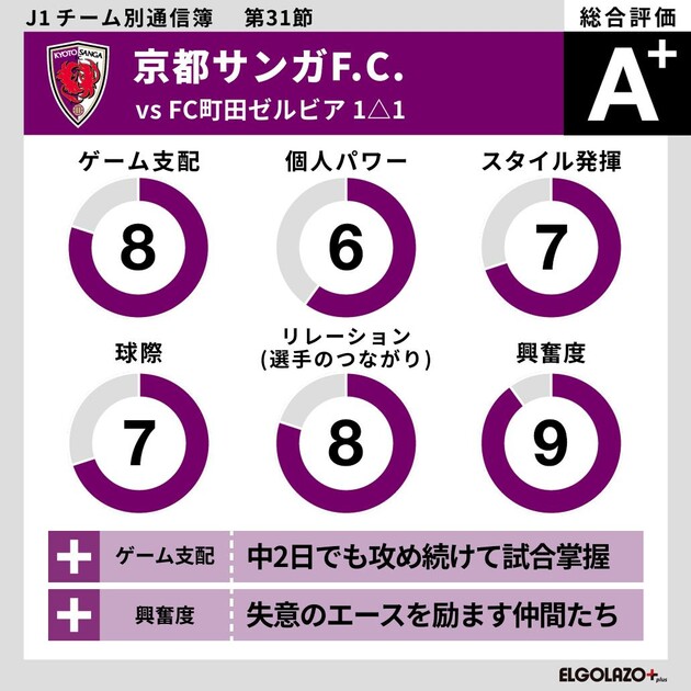 【総評】前半は相手の堅守に苦戦したが、後半はボールを持つだけでなく何度もゴールへ迫った。中6日の相手に対して、日程的には不利な中2日の京都がアグレッシブな戦いを披露して、勝利にあと一歩まで迫ったことは評価したい。試合終了後、PK失敗に落ち込むラファエル・エリアスに仲間が駆け寄り、客席からエールが送られた場面も心を揺さぶられた。