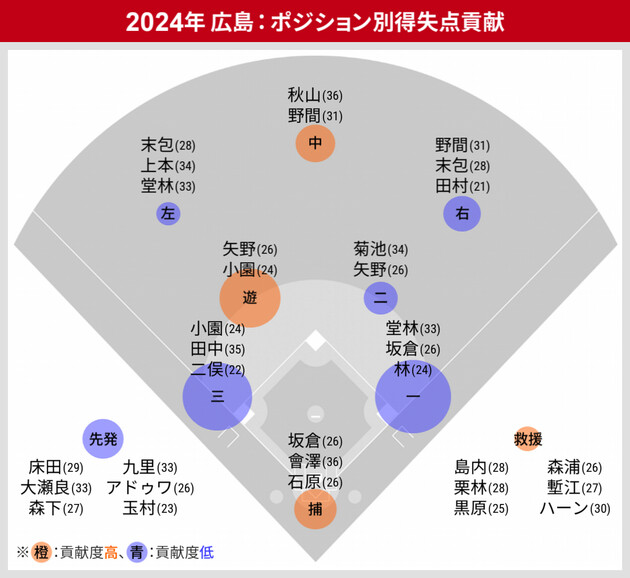 また後述の選手名とポジションがマッピングされている画像の円は、橙色が得失点貢献でプラス、青色は逆にマイナスであり、円のサイズは数値の絶対値の大きさを示している。橙色の円が大きいほど貢献度が高いことを表す。