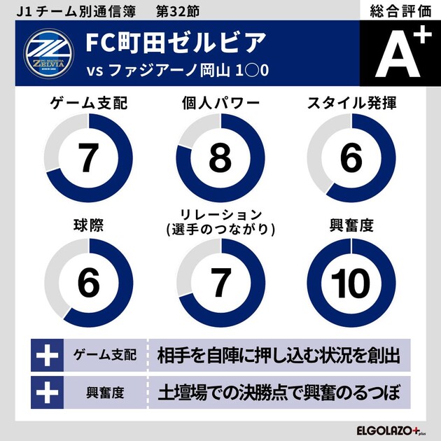 【総評】岡山の攻撃時のボリューム不足に乗じてほぼ相手にチャンスを与えずにゲームを支配。相手の攻撃機会が少ない中でも守備陣は集中した対応で無失点推移を実践。また1点勝負の様相を呈する中、土壇場で個人パワーを最大瞬間風速的に出力して勝利。優勝戦線に踏みとどまる劇的な勝利にホームスタジアムのボルテージは最高潮に。