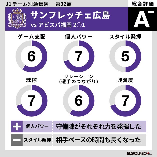 【総評】メンバーを大幅に変更しても堅固に守れる強みを失わず、リーグ戦4試合ぶりに勝利。17分に先制したあとは難しい時間を過ごしたが、大迫敬介をはじめとした守備陣がバタつかずに守って得点を許さず、86分に追加点を奪取。相手を上回った時間は長くなくても、重要な勝点3を獲得した。