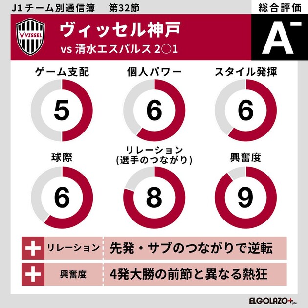 【総評】序盤の好機を決め切れずに失点する最悪の展開。それでも挽回を期した鍬先祐弥の同点弾、そして飯野七聖、小松蓮の最終盤での同時投入、酒井高徳のボランチへの配置換えが劇的逆転弾につながった。選手間はもとより、ベンチワークも含めたリレーションの力での勝利。前節・東京V戦は4-0で大勝したが、また異なる熱狂がノエビアスタジアム神戸を包み込んだ。