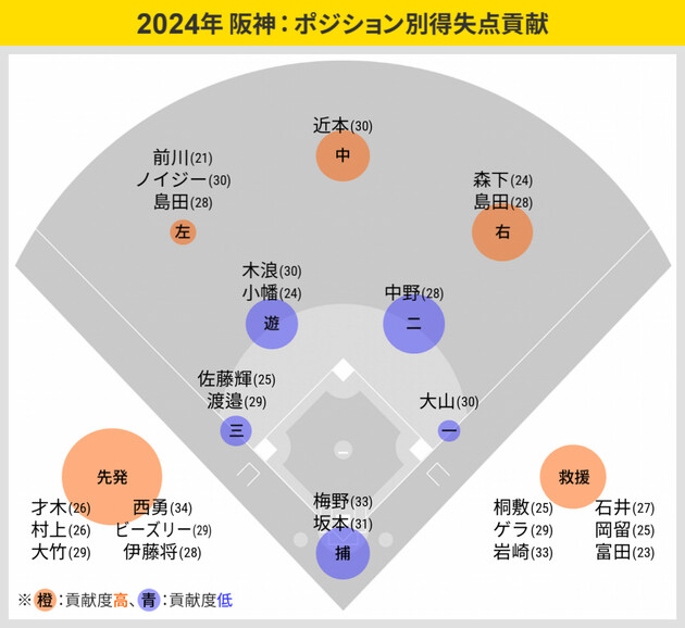 選手評価は、野手の打撃をwRAA(Weighted Runs Above Average)、守備にはUZR(Ultimate Zone Rating)、投手はRSAA(Runs Saved Above Average)を用いている。いずれもリーグ内の平均的な選手と比較して、打撃・守備・投球でどれだけ得失点に貢献しているかを示した指標であり、本稿ではそれぞれ同一ポジションの平均的な選手と比較している。なお、RSAAの計算式で使用される失点率は実際のものではなく、守備の影響を排除したtRA(True Run Average)を使用している。