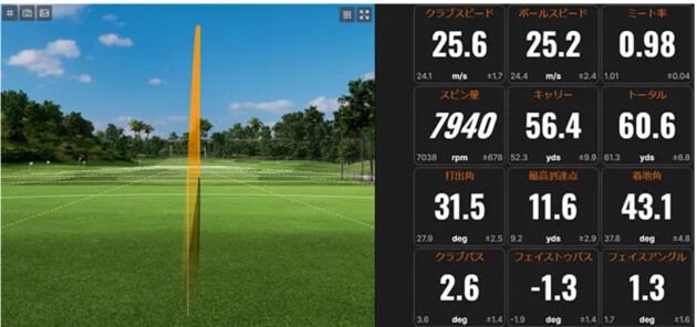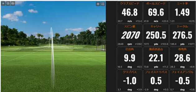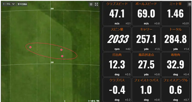 初速は約70 m/sとしっかり出ていますが、いくら初速が早くてもスピン量が多ければキャリーもランも出ません。初速とスピン量が高いレベルで両立しているので、トータル飛距離が飛ぶのも理解できます。