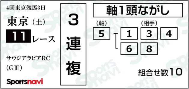 5-[1、3、4、6、8] の3連複軸1頭流し(10点)