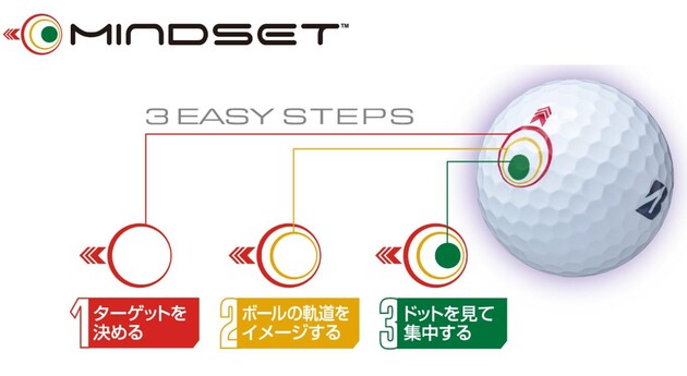 ツアーボール「TOUR B X/XS」で好評を博した“3ステップルーティン”をサポートするマーク「マインドセット」を搭載したモデルで、ショット前の集中力を高め、イメージ通りのショットをサポートする設計です。