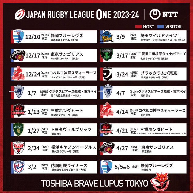 東芝ブレイブルーパス東京の開幕戦は、静岡ブルーレヴズと味の素スタジアムでの対戦となりました!
