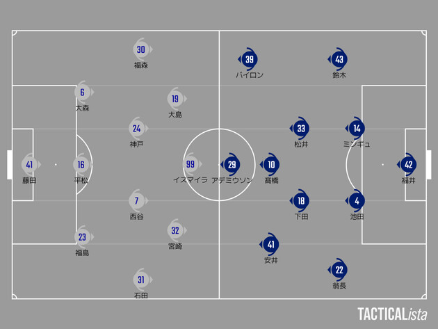 デュークがオーストラリア代表に、藤尾と平河がU-22日本代表に選出され、離脱。そのため、ボールを動かせる、地上戦重視のメンバーに。今週に加入が発表されたアデミウソンはさっそくスタメン。