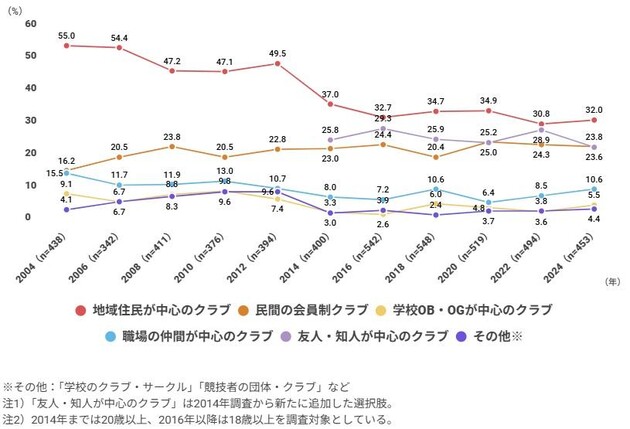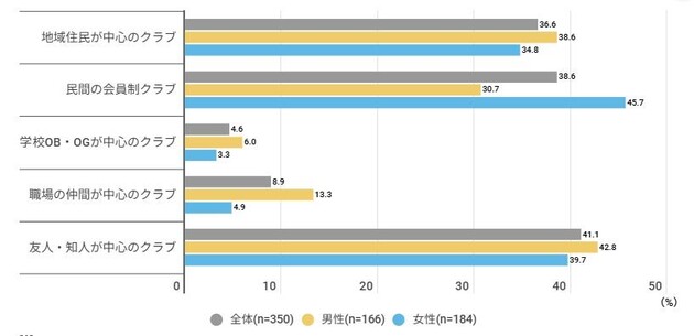 日本には「コミュニティ・スポーツ」という言葉がある。都市化に伴って地域社会における市民のつながりが弱まりつつあった1970年代ごろから、従来は学校や職場で行われることが多かったスポーツが家族や仲間とともに生活の中でも行われるようになり、地域社会を基盤とする同志感情によって支えられるスポーツの存在形態として称される。この言葉が行政的に扱われたのは1973年の経済企画庁(現内閣府)による「経済社会基本計画-活力ある福祉社会のために」においてであり、そこでは「地域住民相互の接触を深め、新しい時代に合致したコミュニティ活動の場の形成に貢献すること」が期待されていた1)。欧米ではスポーツを通じたコミュニティ形成としてスポーツクラブがその中心的な役割を果たしており、文化的背景が異なる日本でも同様の動きはみられるものの依然として一部の人たちに留まっているように思われる。 スポーツライフ調査では1994年からスポーツクラブ・同好会・チームの加入状況を継続的に調査しているが、2014年以降は全体の加入率が2割を下回り、2024年は15.2%で過去最低となった。性別にみると、男性は17.1%で前回から横ばいであったが、女性は13.4%で減少傾向が続いている。特にコロナ禍においてはスポーツジムでのクラスター感染が発生し、行動制限によって運動やスポーツの実施そのものが個人化に向かったこともあり、スポーツを通じたコミュニティ形成のあり方にも変化を与えた可能性がある。
