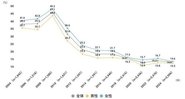 スポーツライフ調査からスポーツクラブ・同好会・チームへの加入希望率の年次推移をみてみよう。同調査では開始当初の1992年から把握しているが、ここでは図1で示した加入率の年次推移に合わせて2004年から2024年までの結果を示す(図2)。加入希望率は全体で47.1%であった2008年を境に低下傾向が続き、2024年は14.0%とピーク時の3分の1 以下にまで減少している。また2004年から長らく女性が男性を上回る傾向にあったが、その差は2018年に縮小したのちコロナ禍でやや開き、2024年では再び縮小している。