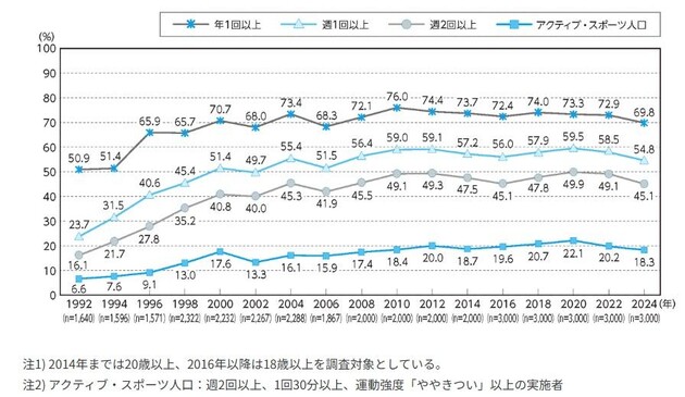 運動・スポーツ実施率、コロナ禍前の水準には戻らず。国民の3割が過去1年間にまったく運動・スポーツをしていない結果に。