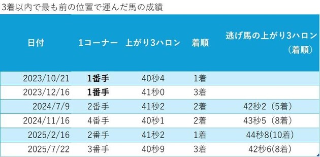 3着以内に入った馬で、最も前付けした馬の番手と上がり3ハロン、また右端は参考として逃げ馬の上がり3ハロンをまとめました。