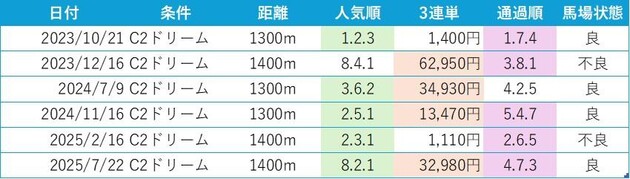 下表は今夜と似た条件の「C2クラス」「ドリームシリーズ」「1300~1400m」での逃げ・先行馬の成績をまとめたもの。