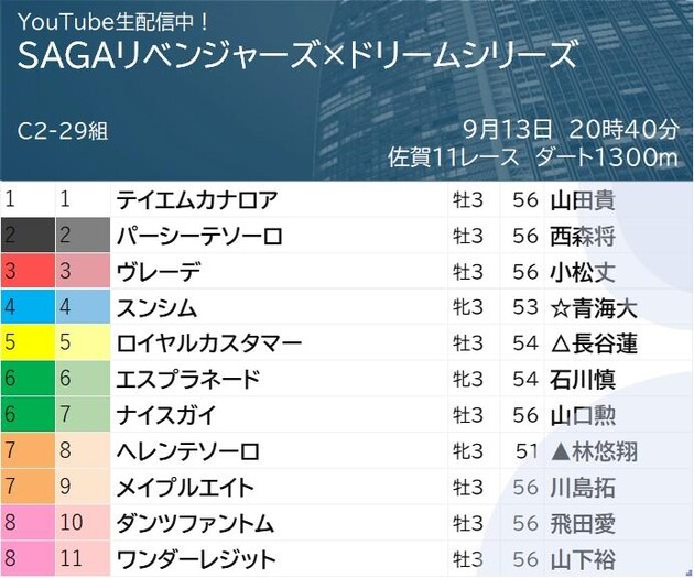 今夜の佐賀最終レースは「C2クラス」「ドリームシリーズ」「1300m」という条件。