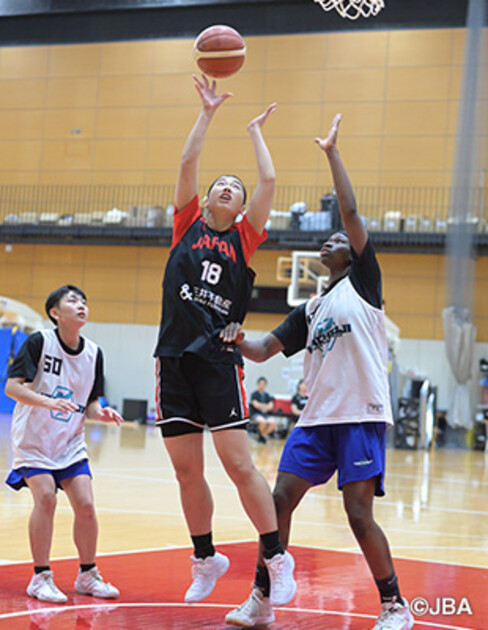 日本の課題であるリバウンドに対し、練習中は飛び込んでチャンスをつなげていたのが小林 蘭選手(四日市メリノール学院高校1年)です。所属チームではパワーフォワードですが、「このチームではスモールフォードになるので、上の位置からコートを見るのが新鮮で、まだまだできないことも多いです」と進化中です。「ジャンプ力には自信があります。大会ではもっと大きな相手とマッチアップしなければならないですが、相手の高さに勝てるぐらい飛んでリバウンドを取りにいきたいです」と長所を生かして、ポジションアップの成果を試します。