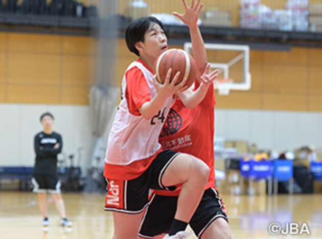 センターの清水天翔選手(佼成学園女子高校2年)は、「フィジカルに自信があるので、パワーを生かしてチームに貢献できるようにしたいです」と頼もしい存在です。中学入学とともにバスケをはじめ、全国大会への出場経験はありません。「知識が少ない中でも、このチームでプレーさせていただき新しい発見ばかりです」と見て真似てどんどん吸収しています。合宿中はポジションに関係なくオールラウンドに取り組み、「ハンドラースキルも本当に勉強になりました。これからもバスケを続けていくためには、もう少し3ポイントシュートの確率を上げたり、積極的にドライブしていきたいです」と清水選手は述べ、成長につなげています。