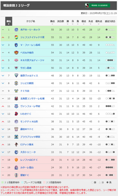 明治安田J2リーグ 順位表
