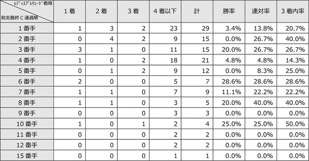 ただし、第18回(令和3年)以降の過去4年に限ると、「1番手」の馬は[0-0-0-7](3着内率0.0%)、2~8番手の馬は[4-4-4-15](3着内率44.4%)、9番手以下の馬は[0-0-0-5](3着内率0.0%)である。近年の傾向を重く見るならば、前走の最終コーナーを先頭や9番手以下で通過した馬は割り引きが必要だ。