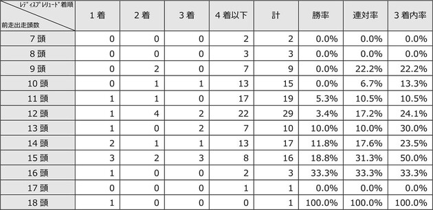 なお、第14回(平成29年)以降の過去8年に限ると、11頭以下の馬は[1-2-1-35](3着内率10.3%)、12頭以上の馬は[7-6-7-38](3着内率34.5%)である。前走が少頭数のレースだった馬は、評価を下げるべきだろう。