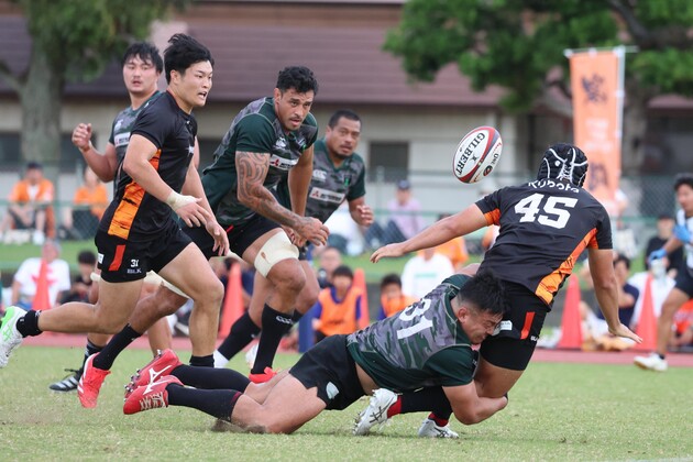 だが試合は直後のリスタートからの1プレーで決する。レシーブしたダイナボアーズが蹴り返すと、スピアーズは一度展開してからキックを蹴り、相手がファンブルしたボールを二村選手が奪ってトライを取り、再び点差を突き放した。