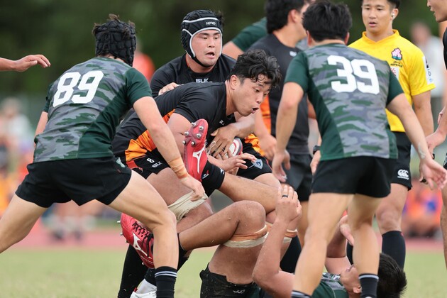 セットプレーから得点を取ったかと思えば、その直後にはアンストラクチャーアタックからあっという間にトライを取り切る。相手ラインアウトのオーバーボールに福田選手が反応すると、押川選手へと繋ぎディフェンスの背後にキックを落とす、これをキャッチした島田選手は阿吽の呼吸で背後にいた松下選手にパスすると瞬時に2トライ目を獲得した。