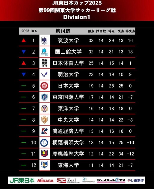 10月に入り、ナイターから昼間の試合へと移行した『JR東日本カップ2025 第99回関東大学サッカーリーグ戦』。第14節は、全6試合中4試合が引き分けに終わり、うち3試合がスコアレスドローとなる混戦状態に。首位・国士舘大学も7位・東洋大学とドロー決着となったが、一方2位の筑波大学は3-1と快勝。結果、勝点1差の両チームの順位は入れ替わり、筑波大が第6節以来8節ぶりの首位を奪取した。また3位・明治大学と4位・日本体育大学の直接対決は、日体大が先制点を守り切って勝利。再び3位に浮上し、明大は4位に順位を下げた。一方5位以下は、筑波大に敗れた8位の中大以外の7チームがすべて引き分けに終わり順位変わらず。8位から12位までは勝点3差内と、残留争いがより一層厳しいものとなった。