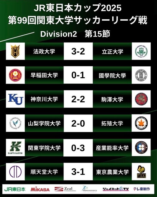 『JR東日本カップ2025 第99回関東大学サッカーリーグ戦』2部リーグ第15節は、10月8日(水)に全6試合が行われた。