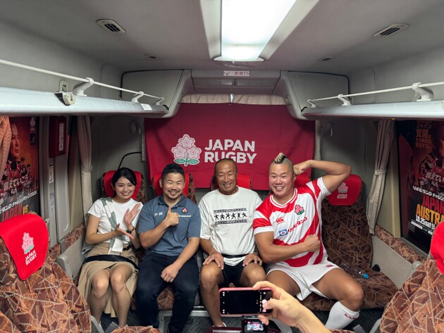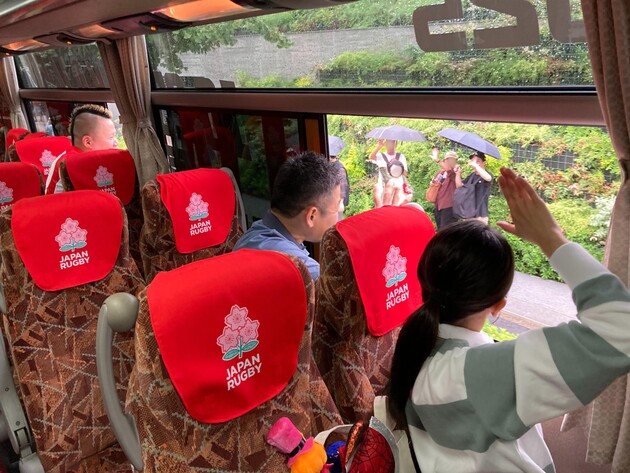 するとしんやが突然「これ、告知した方が良いっすよね!?良いですか?」とバスの窓を開け「ラグビー見に来てくださーい!アジャーストッ!!」と叫び始めた。するとフミさん、杏奈ちゃんもこれに続き「見に来てくださーい!」「日本代表応援よろしくお願いしまーす!」と始まったのだ。