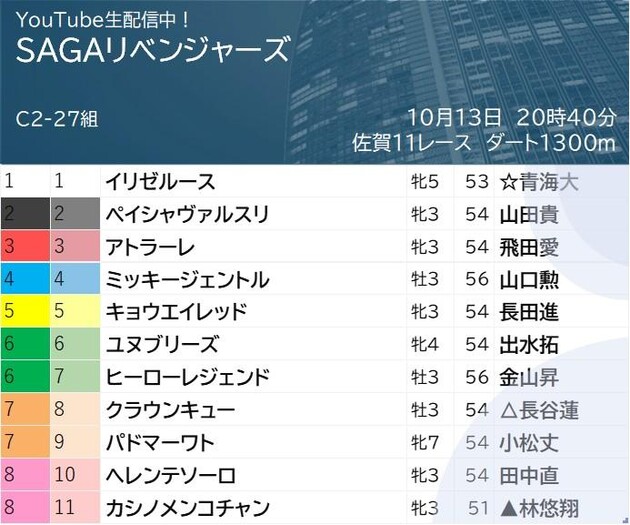 さて、今夜の最終レースは「全馬未勝利」「C2クラス」「1300m」という条件。